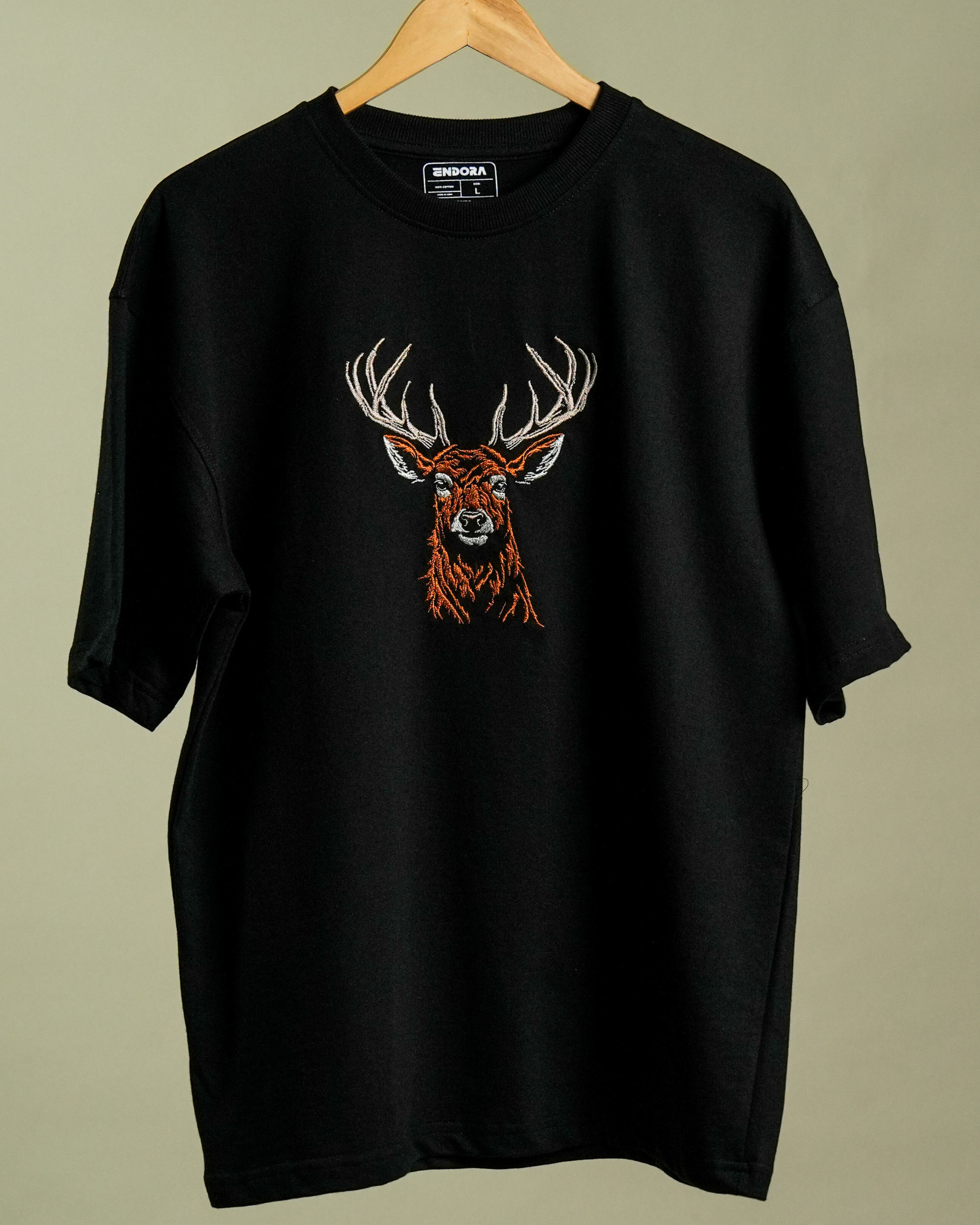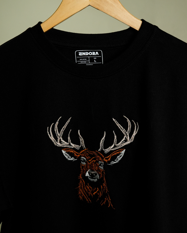 Realistic Deer Head – Oversized Embroidered Cotton T-Shirt